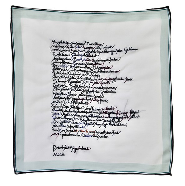 the white handkerchiefs, which are often framed with a coloured frame or embroidery, serve as a pictorial background on which the poems with their seemingly sculpted calligraphy, appear almost like autographs - only that the handwriting does not go back to a writing tool, but to needle and thread. are the "handkerchiefs" works of visual art or works of literature?