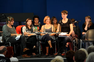 julian schutting mit seinen studentinnen irmgard fuchs, anna gschnitzer, bernadette ralser und erna serles;
