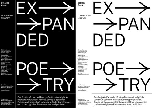 das projekt "expanded poetry – bruttonationalglück" übersetzt gedichte in visuelle sprachen. poesie wird prozesshaft in bewegte bilder transformiert und in den digitalen raum verstreut und publiziert.