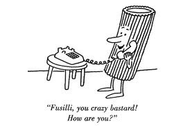 ausgehend von dem new-yorker-cartoon von charles barsotti, auf dem eine rigatoni-nudel telefoniert und erfreut ausruft: “fusilli you crazy bastard, how are you?” sollen im seminar extrem verdichtete kürzestwitze, die gleichwohl auch poetisch sein können, geschaffen werden, die ich dann versuche umzusetzen. wer möchte, kann auch selbst zeichnen. es geht um die essenz, die entweder ohne große umwege erreicht werden soll, oder um ecken und erweiterte ebenen. was ist witzig? ist witzig, was alle witzig finden? wenn nicht, warum nicht? welches genre ist nicht mehr auspressbar? von der königsdisziplin, dem einbildwitz bis zum strip, also maximal 4 bilder (peanuts). die seminarteilnehmer sind quasi gagschreiber für meine witze. am ende könnte man ein kleines büchlein machen, und im comicbuchautomat des muqua verkaufen.