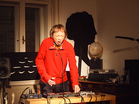 stilisitsch bewegt er sich in den disziplinen von der fragilen impro bis zum heavy freejazz. hinteregger geht sozusagen dem gesang an die gurgel und lukriert aus dem unteren stimmbandbereich ganz erstaunliches, elektronisch entfremdetes gebrüll.