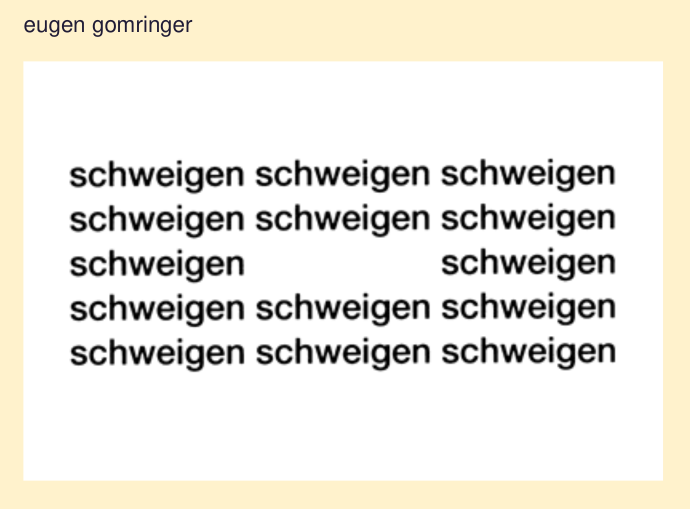 » übersetzung eugen gomringer schweigen neutral ideogram as a purified deletion² homme fen_être¹ schweigend ins gespräch vertieft logical form quadrat perseus offener sternhaufen the blank space: implications of semiotic nothingness in the postwar swiss avant-garde by maggie rosenau university of colorado at boulder 2019 257 pages das durchscheinende bild: konturen einer medialen phänomenologieformel 1 und menschenrechte : sie verraten die, die gefoltert und inhaftiert wurden «