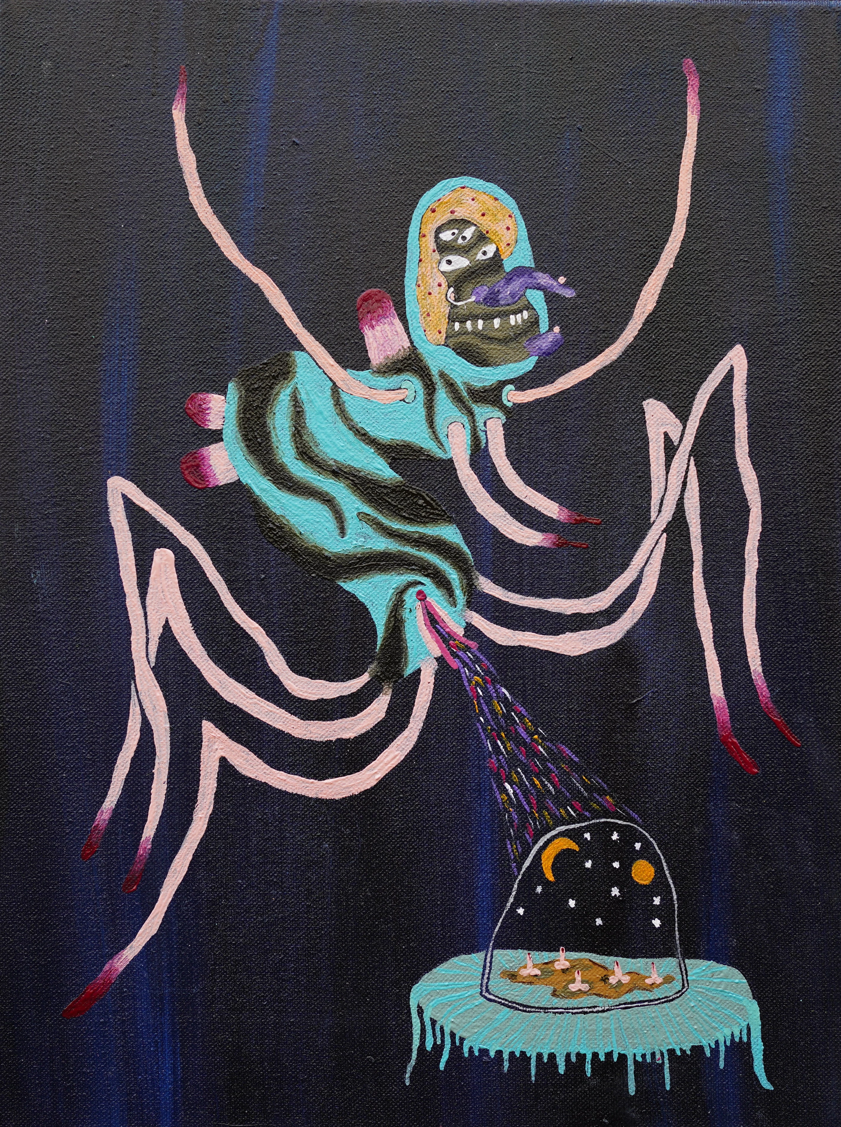 im anflug auf die erde. brauche dringend einen körper. suche ein feuchtbiotop, in dem ich gemacht werde. werde schlammgeboren, kind der liebe, die welt erwacht. bin ein vollständiger kosmos. kiemen für den unendlichen ozean, flexibler rumpf für unterirdische gänge, lange fänge, falls die vatermännchen mich fressen wollen, facettenaugen in alle richtungen, schlangenzunge zum riechen, spinnenbeine mit tastzärtlichen spitzen, arme mit milchdrüsen, um mich selbst zu säugen, falls ich die mutterweibchen irgendwann verliere, und das muss ich. Werde schnell zum fleischfesser. was ich mir einverleibt, gefressen, verdaut habe, schießt mein ausscheidungsorgan in die außenwelt. ausgeschiedenes wird zu einem neuen kosmos, wieder ein kleines feuchtbiotop, in dem es wimmelt. beobachte wie sich unter dem glassturz würmchen formen, wie sie sich ringeln und betteln. ich befruchte sie mit eizellen aus meinem körper, und neue vollständige wesen entstehen. meine kinder können alles werden, was sie wollen.