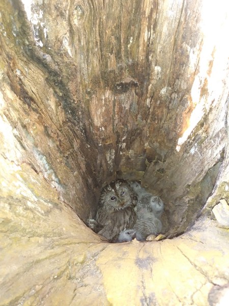 die Wildkamera, auf jede Bewegung in ihrem Winkelbereich reagierend (seien es auch nur rasche Fliegen oder im Wind wachelnde Äste), kommt mit der Schnelligkeit der anfliegenden Käuze kaum mit, so daß fast immer nur deren Landung (als dunkle Federnmasse) an der Einflugsöffnung am Baumstamm kurz zu sehen ist, anschließend ihr Verschwinden im hohlen Baum und kurz darauf wieder ihr Heraufkommen, wobei das irisierende Augenlicht zuerst auf die eine und dann auf die andere Seite gedreht einzeln erscheint, kaum einmal ein Blick von 2 Punkten geradeaus nach vorn zum Beobachter (zur Infrarotkamera) her (hin), die kratzenden Geräusche des Abrutschens innen im hülzernen Hohlraum bis zu Nistplatz am Boden sind allerdings gut zu vernehmen (wenn man sie einmal als solche erkannt hat)
